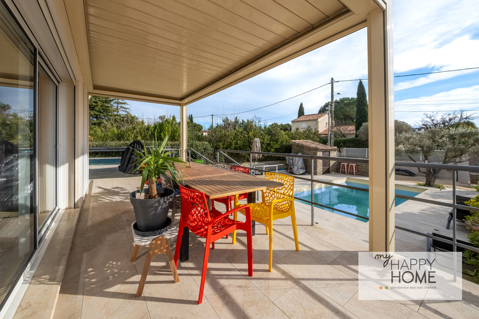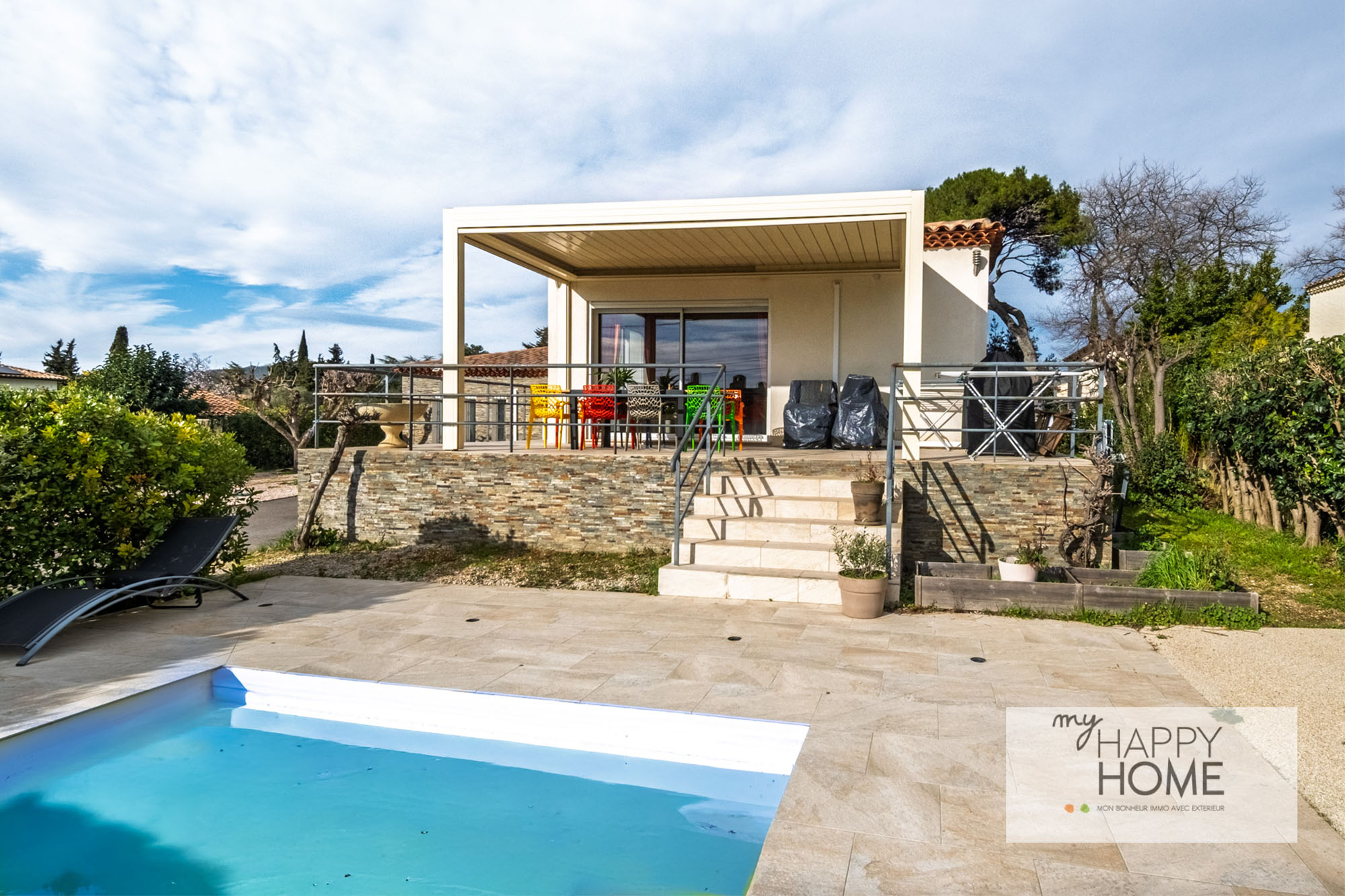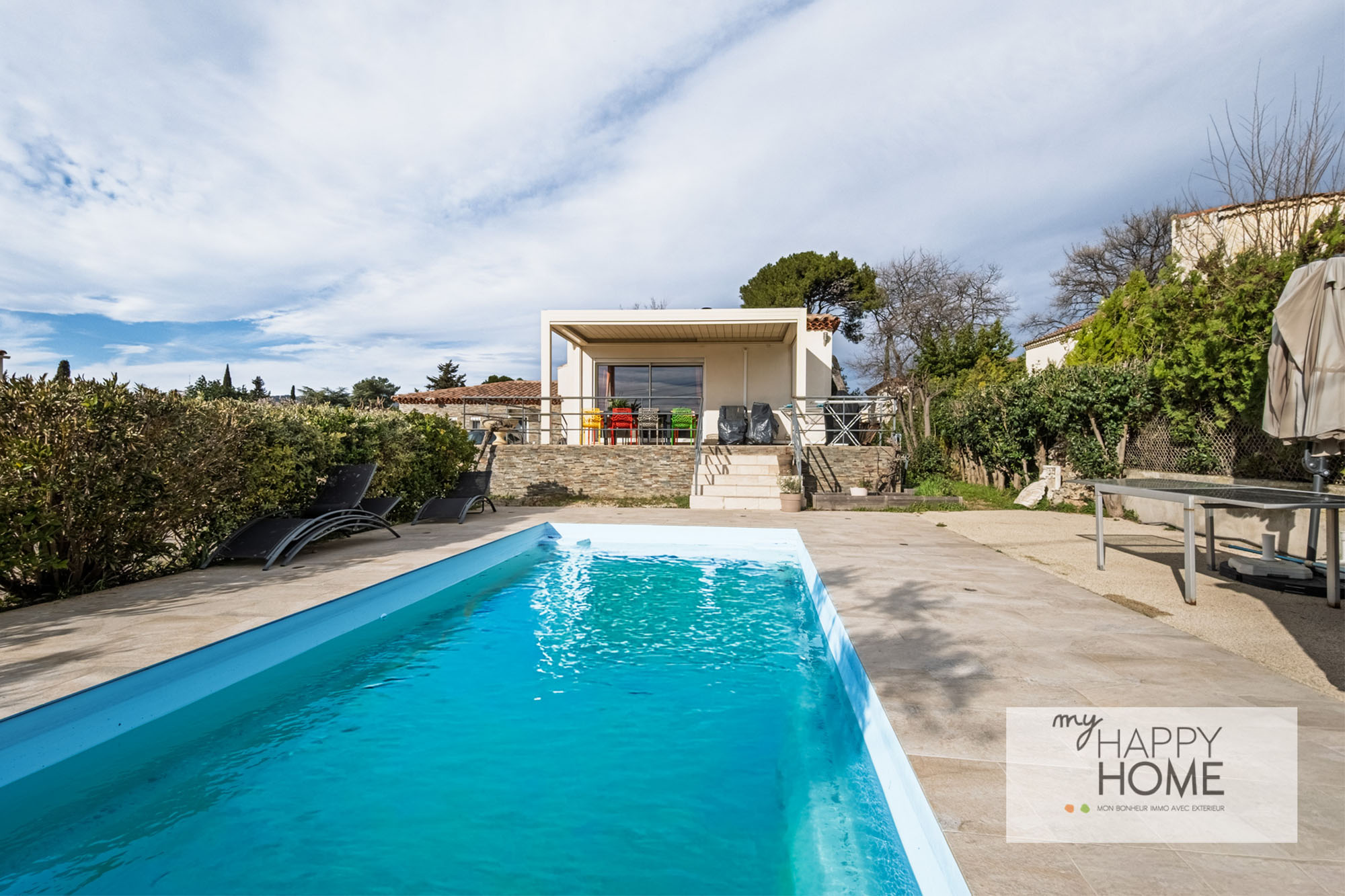Exposé Sud et sans mitoyenneté, la maison et sa terrasse dominent le jardin et la piscine.